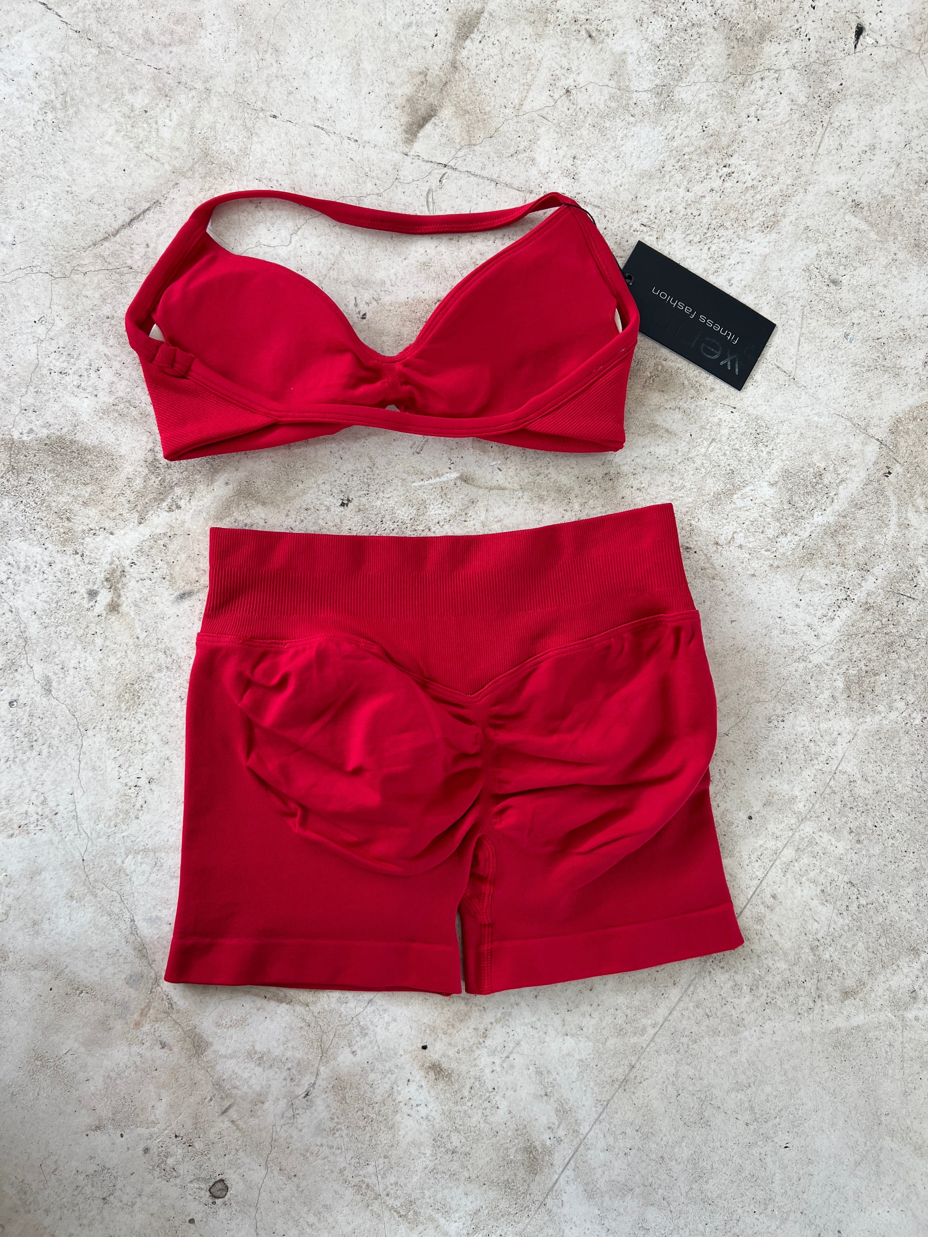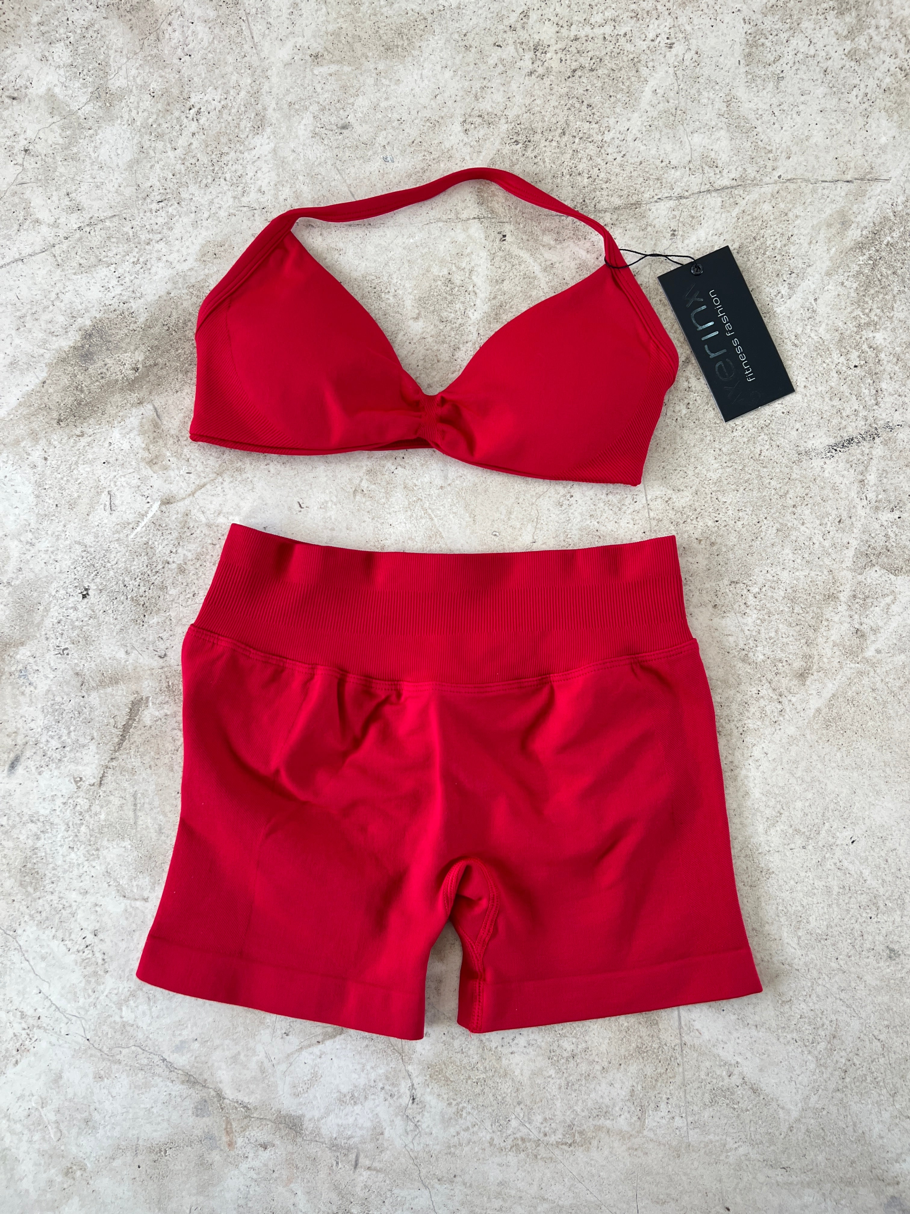 Set de short con plisado en glúteo y top con copas removibles.